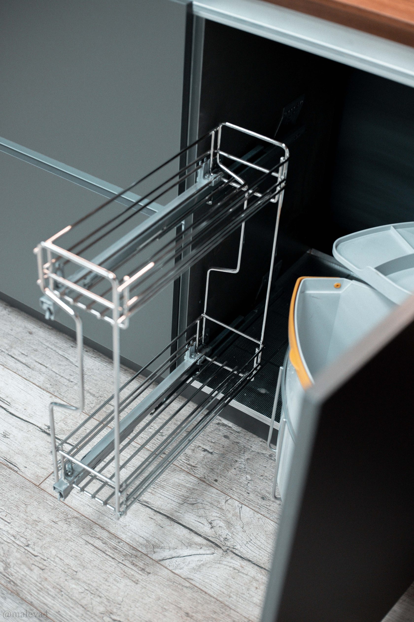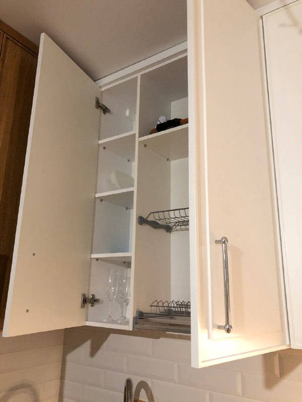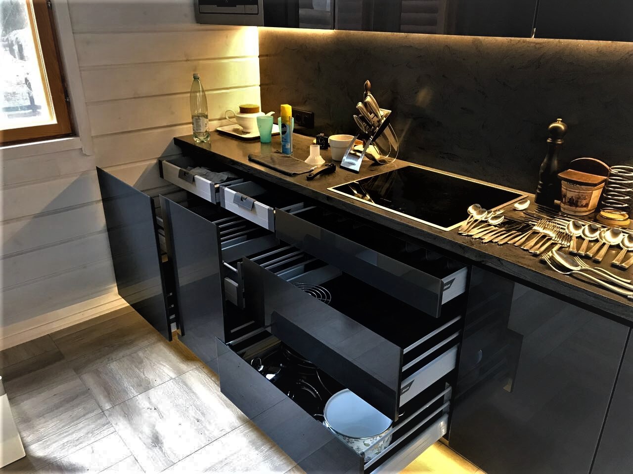 От высоты шкафов, их количества и наличия полок и ящиков зависит расход ЛДСП EGGER (Австрия), который составляет определенную часть от стоимости кухни. - Фурнитура и наполнение