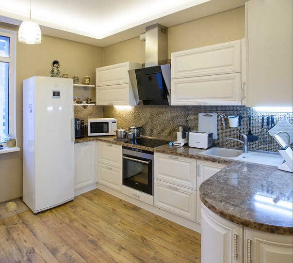 - Столешница и фартук могут выполнены из искусственного камня Tristone (Корея). Стоимость погонного метра такого материала стоит от 26 тысяч рублей. А могут из дсп, облицованного пластиком, цена которого от 3 тысяч рублей